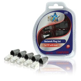 Fiche réseau RJ45 male, avec manchon, pour cable ethernet, paquet de 5 pièces?HQ Ensemble de cinq connecteurs FTP CAT5e avec manchons de protection du câble. Connecteurs: RJ45 mâle Plaqué or: Oui Signal: Numérique Type: Droit Matériau externe: PVC